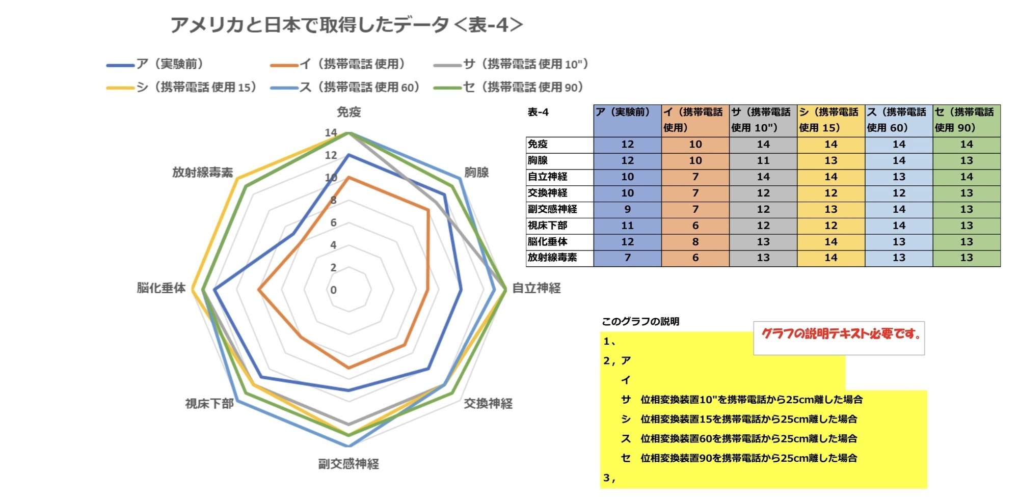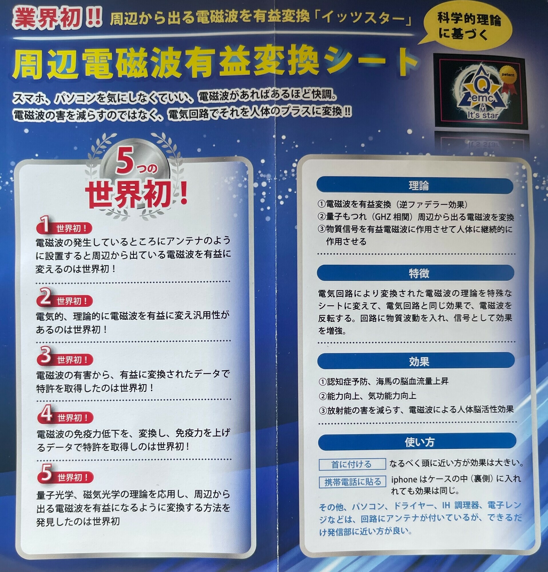 ア、1の電磁波を回転させるもの(360度位相変換) 又は、右旋左旋円偏波(円2色性変換)があるこれが2個又は、2層あると、周辺から出る電磁波も同じように有害から有益に変換される、電磁波は距離の2乗に反比例して弱くなるが実際は、3-5メートル有効です